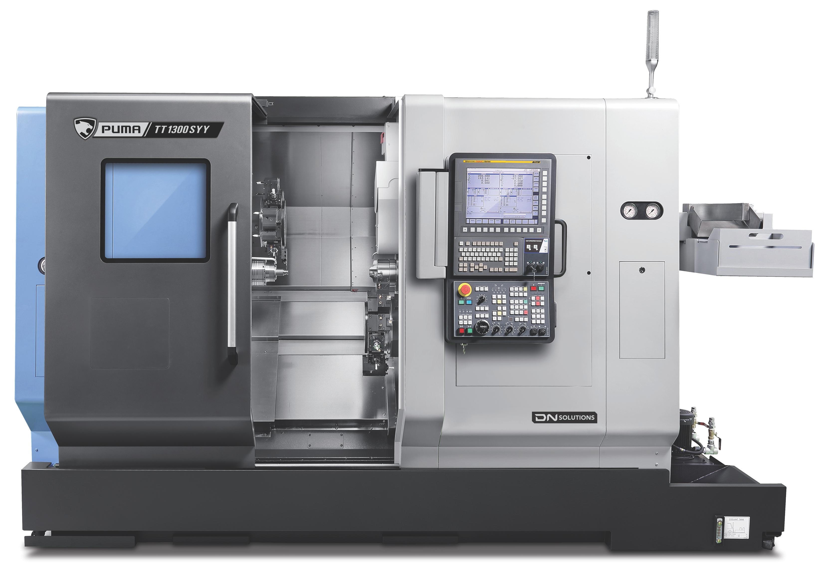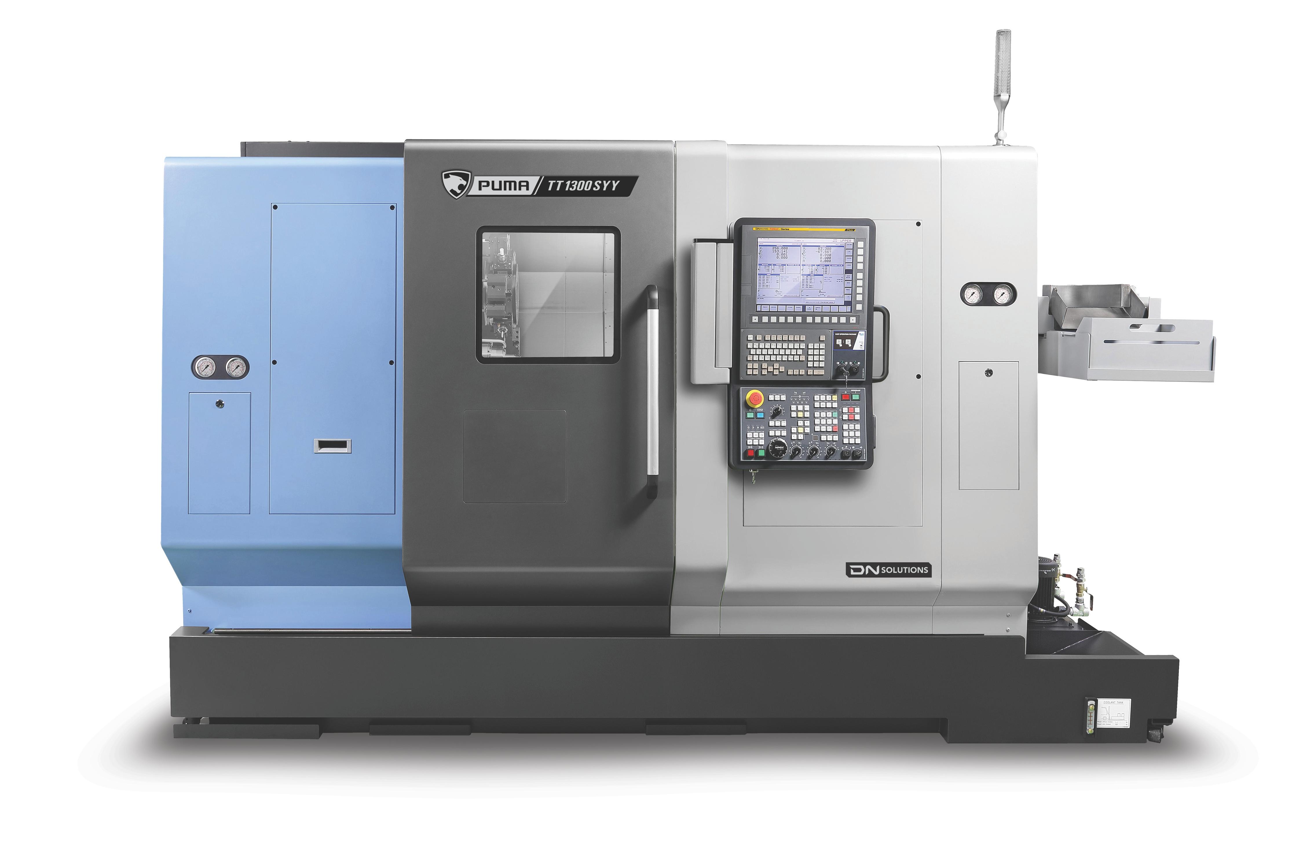 PUMA TT1300, TT1800, TT2100 ja TT2500 -sarjat ovat vaakasorvauskeskuksia, joiden tankokapasiteetti vaihtelee 42 mm:stä 81 mm:iin. Näissä koneissa on kaksi vastakkaista karaa sekä ylä- ja alarevolverit, joiden Y-akselin toiminta mahdollistaa samanaikaisen koneistuksen kahdella pinnalla. Molemmissa karoissa on yhtä suuri teho ja kapasiteetti, minkä ansiosta ne voivat toimia itsenäisesti. Maailmanlaajuisesti suosittu PUMA TT -sarja tunnetaan erinomaisesta suorituskyvystään ja luotettavuudestaan, mikä tekee siitä yhden DN Solutionsin myydyimmistä tuotesarjoista. |